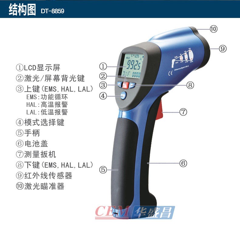 DT-8829紅外線測溫儀一種專業(yè)型的手持式非接觸紅外線測溫儀,使用簡易,設計堅實,測量準確度高,測溫量程范圍寬等特點。它具有激光瞄準,帶背光源顯示器,最大值,最小值,平均值,差值,數據保持,高低溫報警,發(fā)射率可調及自動關機功能。該手持式非接觸紅外線測溫儀可用于測量那些不適合使用傳統接觸式測量方法來測量物體的表面溫度(例如移動物體,帶電表面和難以接觸到的物體)。特征:非接觸式精確測溫高的光學測量距離與物體目標比(D:S-16;1/50:1)測溫量程范圍寬獨特新式的機殼設計內置激光瞄準器自動數值保持℃/F轉換按鍵發(fā)射率調整從0.10 到1.0,(8829固定在0.95)MAX,MIN,DIF,AVG 溫度顯示帶背光源LCD顯示屏自動選擇量程,分辨率為0.1